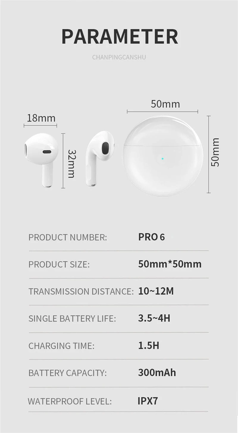 Freisprecheinrichtung Headset Pods Pro6 fone Bluetooth-Kopfhörer für Weihnachtsgeschenke Drahtlose Ohrhörer mit Mikrofon für alle Smartphones